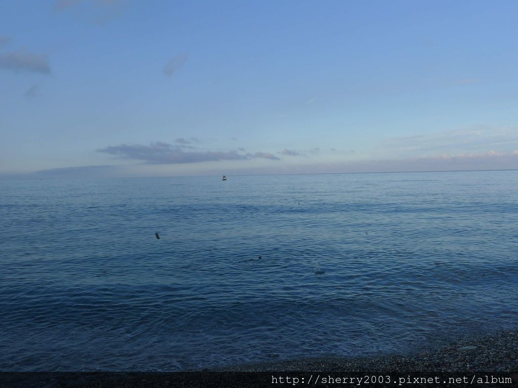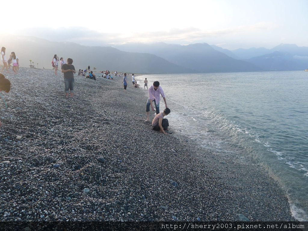 隨手拿起一片片扁平的小石片,往海上丟出玩著水上飄的遊戲,看看能彈起幾次,可惜不比平靜的湖面,總是會有被浪花吞入無聲無息的片刻,小Sherry還丟歪了一片差點飛去水中遊客旁,嚇死人了,趕快撤退...