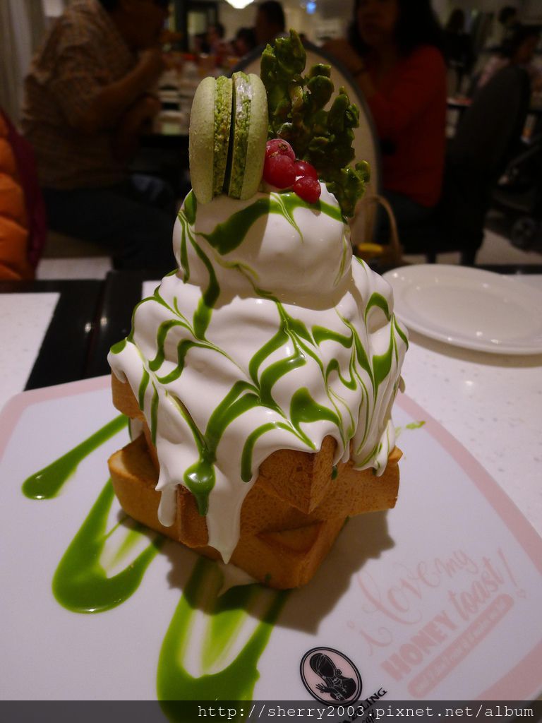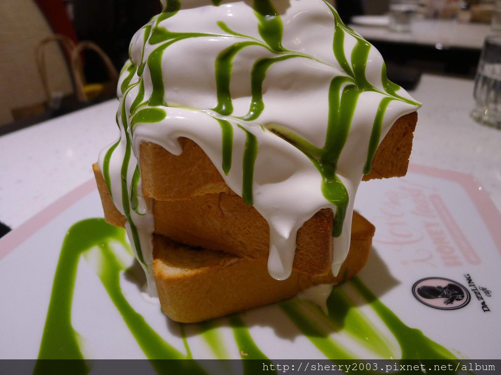 在不規則的三層蜜糖吐司上方閃亮登場的是那一球碧綠色的美麗抹茶冰淇淋。
