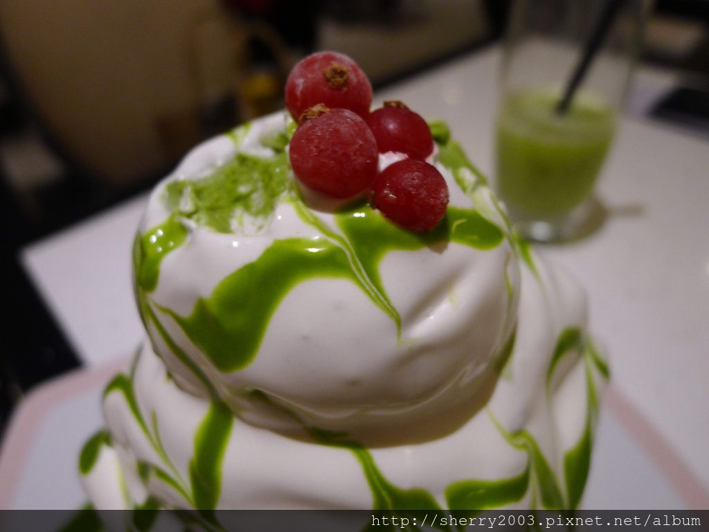 在白雪頂端擺著的是幾顆艷紅色小果子,紅白綠三色的強烈對比特別的搶眼。
