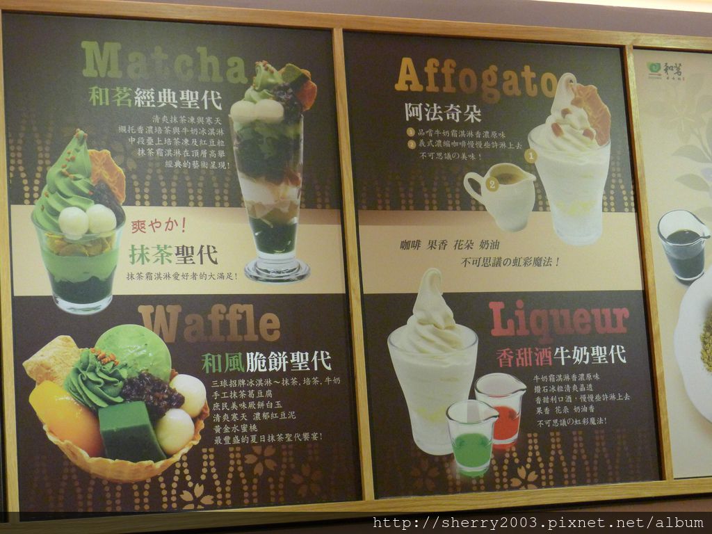 櫃台上方大幅廣告著各式各樣的抹茶甜點,在等待期間可以先看著廣告流口水。