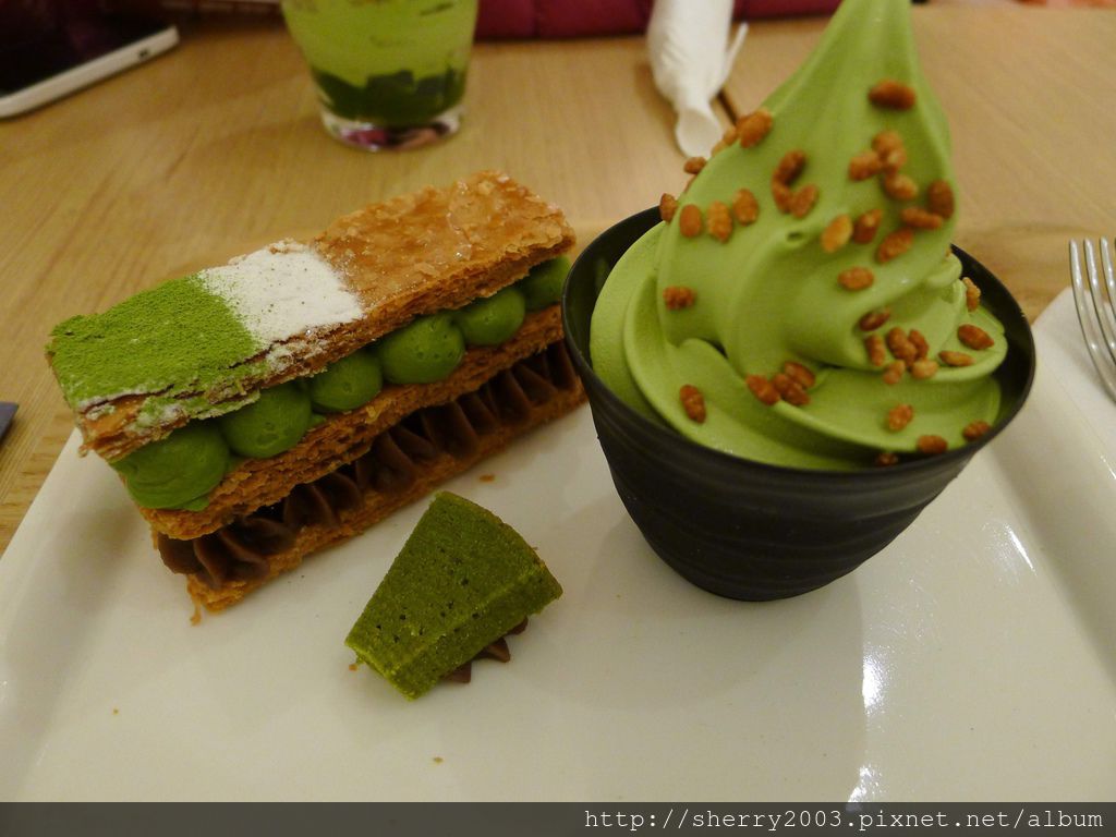 抹茶千層派,整套還包含了一杯的抹茶霜淇淋以及一小片的抹茶千層蛋糕。