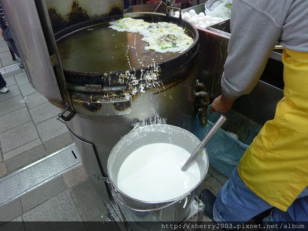 一旁的地上放著調配好滿滿麵糊的大桶,只見老闆迅速地往鐵板上潑灑著一匙匙的麵糊,再塞滿蚵仔後就又是一份蚵仔煎了。