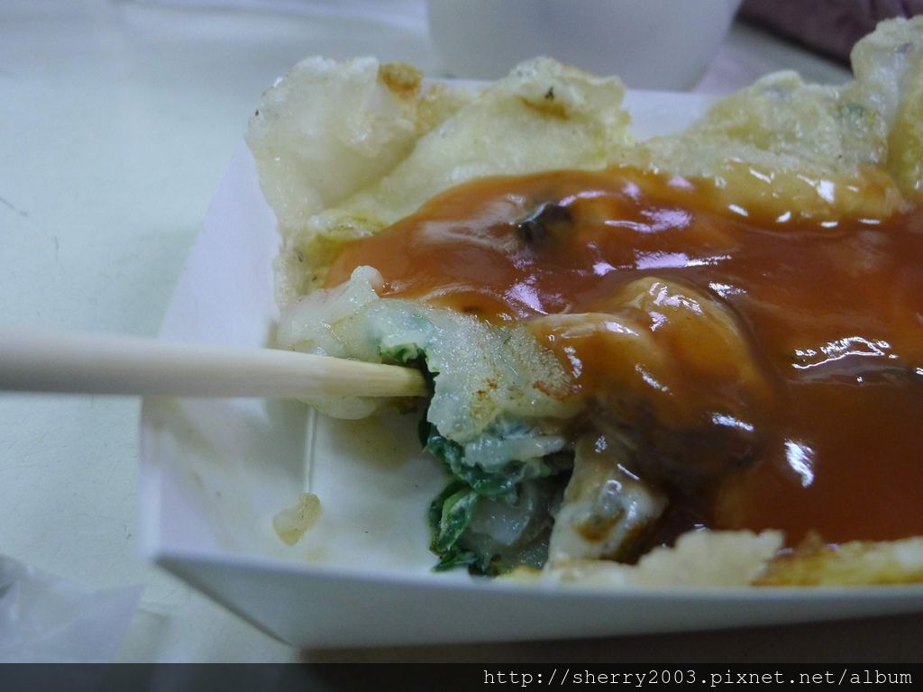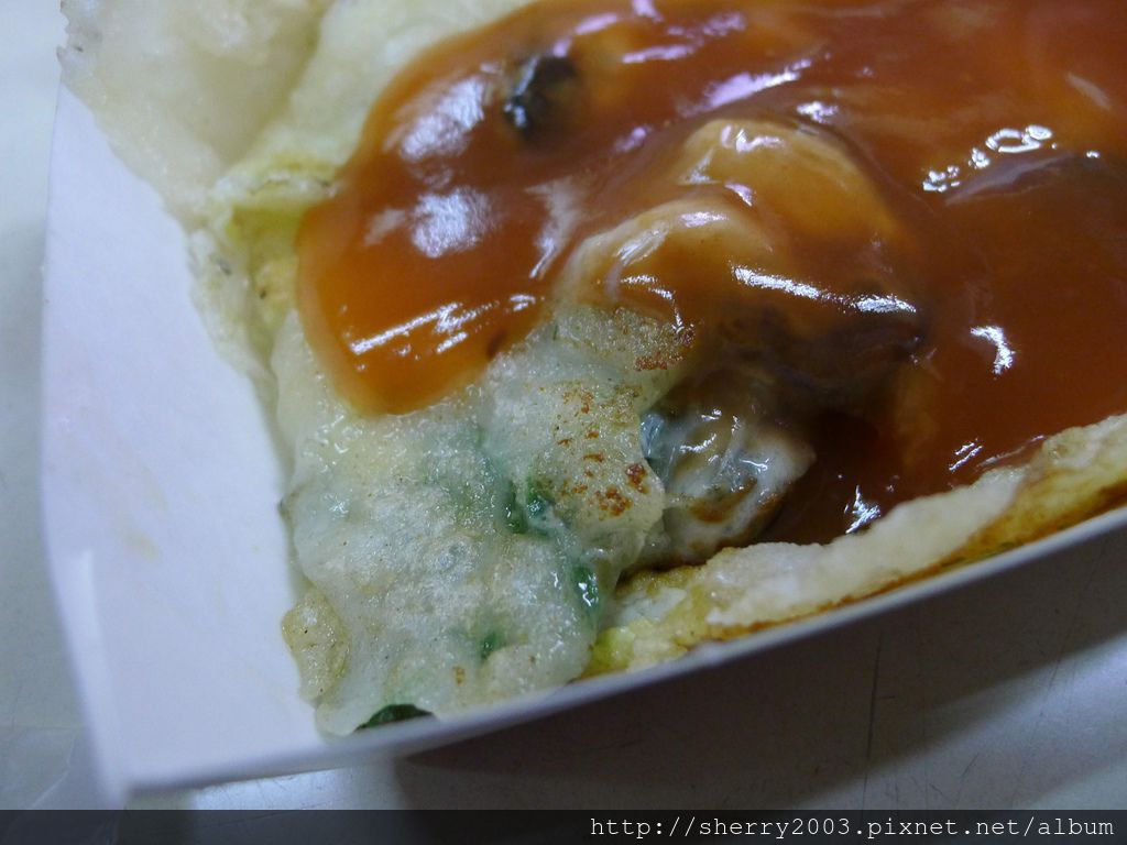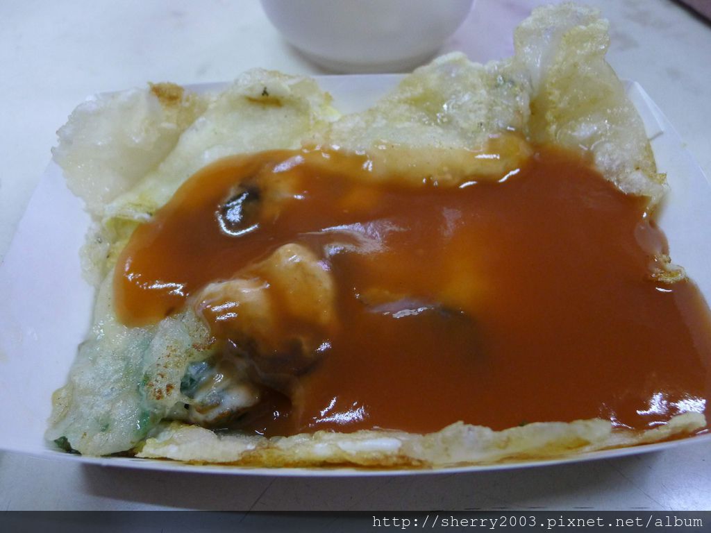淋得滿滿的特調醬汁飄在蚵仔煎上方,好像一泓湖泊一般。