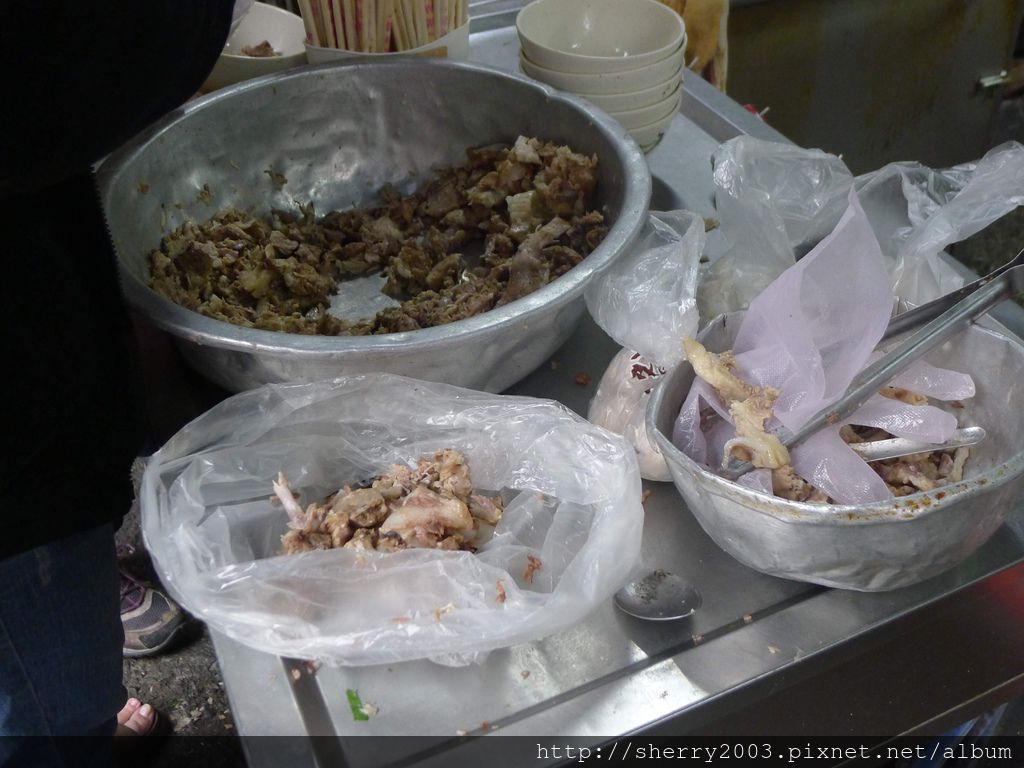攤位上擺著刮好準備使用的骨仔肉,放在碗公內很有趣。