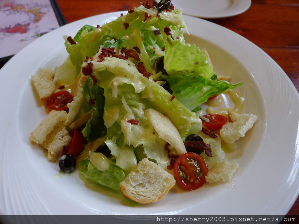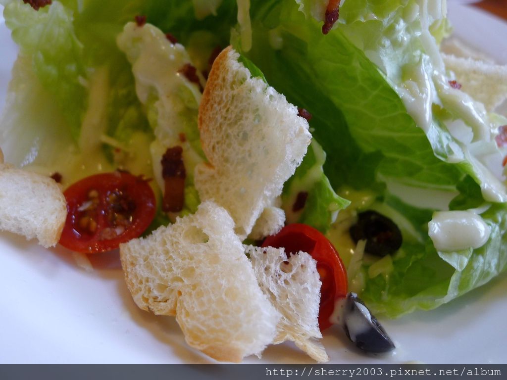 新鮮的小塊麵包、生菜以及番茄上沾滿了凱薩沙拉醬,咬起來還有喀滋喀滋的口感,很不錯。