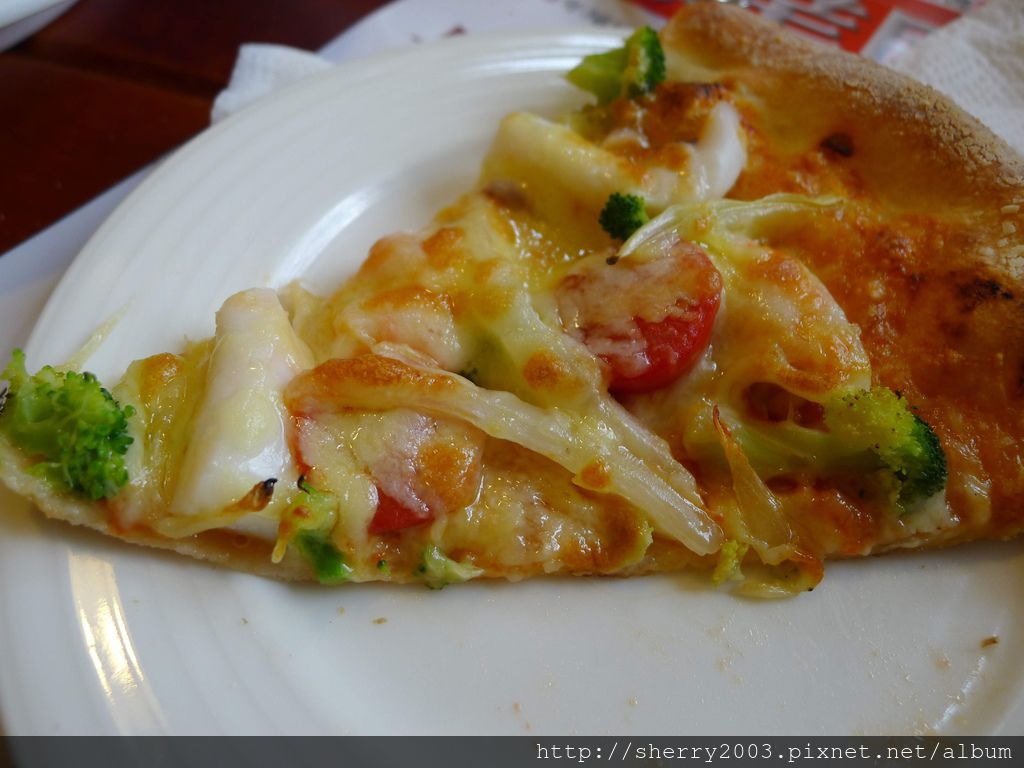 相比起偏軟的薄皮披薩,我們當然是更喜歡道地義大利脆脆的薄皮披薩,不過那超高密度的餡料完全的收買了我們,讓我們也只能一口接一口的努力奮戰。