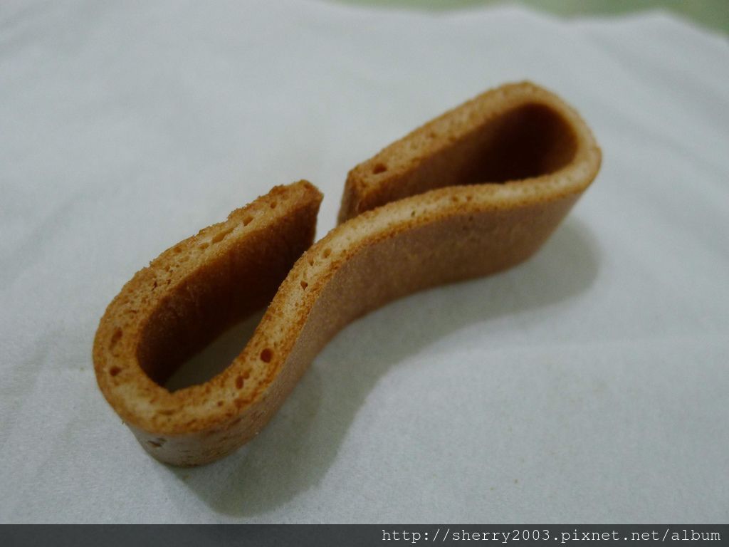 再來試試味增口味的,有點小捲餅的外觀,與原味的不同,是用大片的煎餅捲起後裁切而成的。