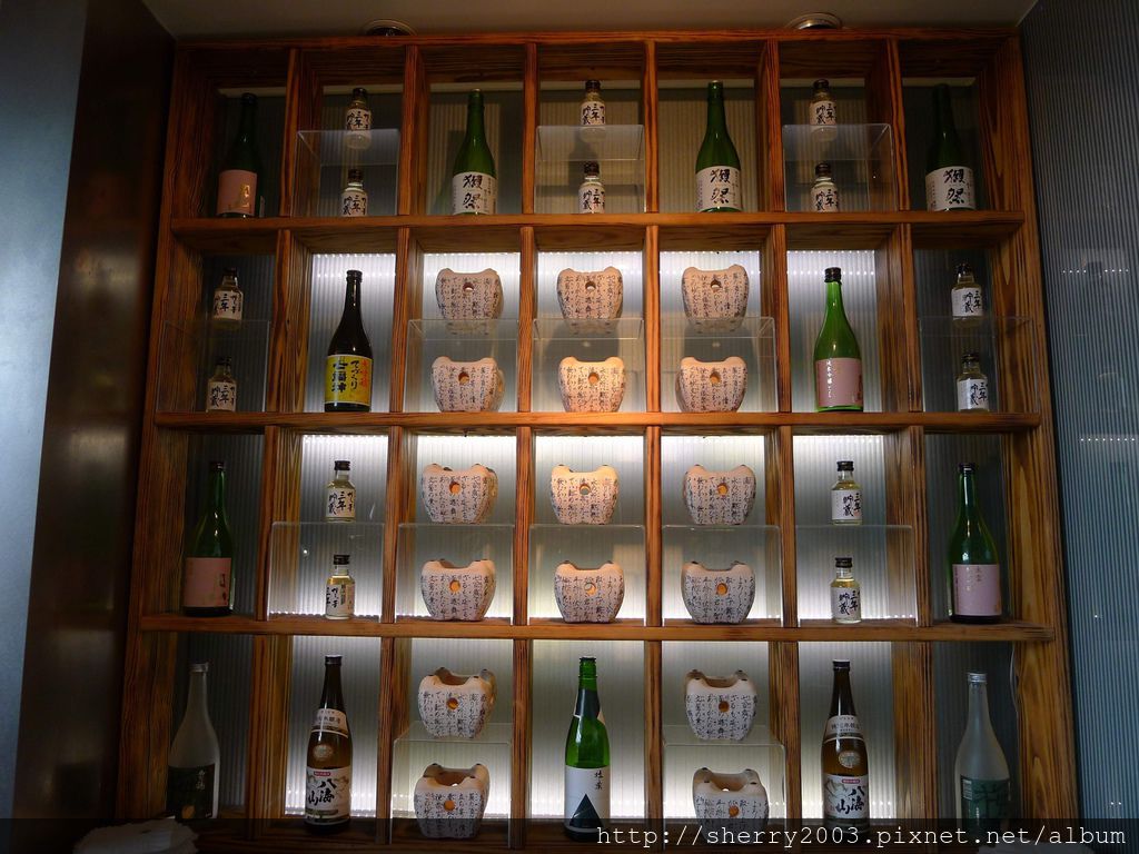 熱炒區上方布置成一格格的日式風,擺滿了各式各樣的清酒,很有和風味道。