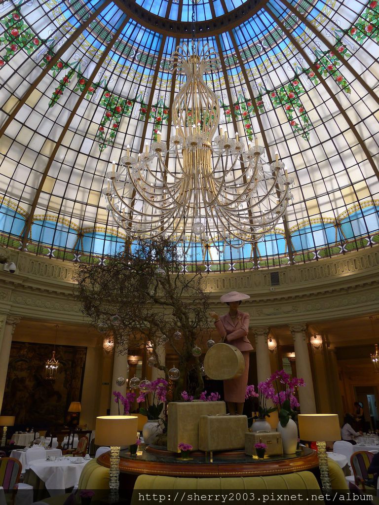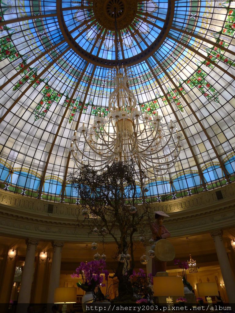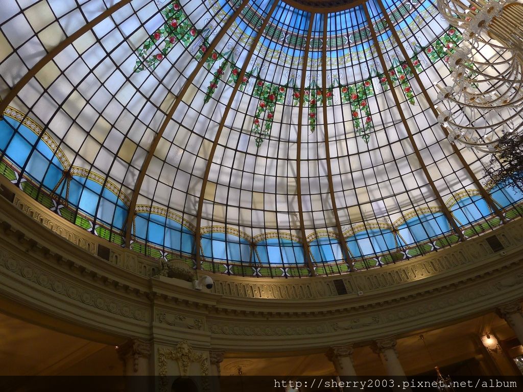 沿著巨大的水晶吊燈往上望,明亮的光線下閃閃發光的是戴著絢麗色彩的玻璃穹頂。