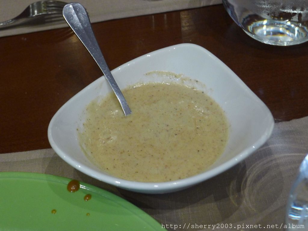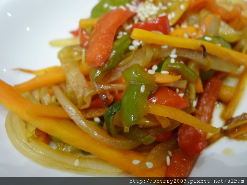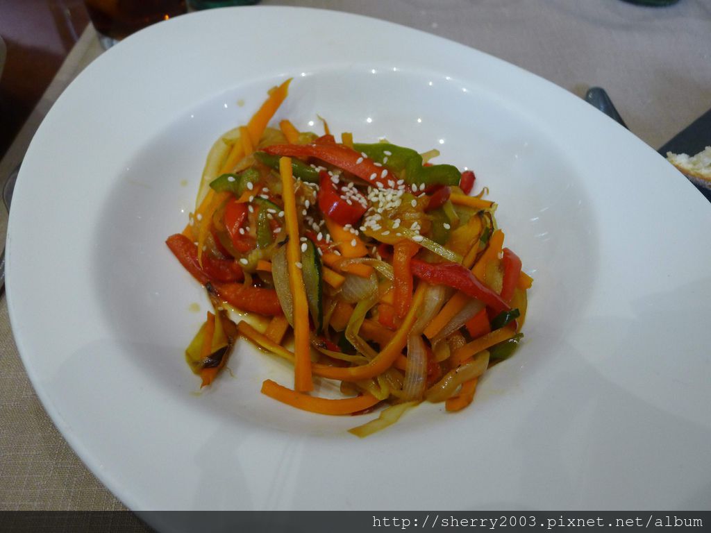 櫛瓜拌紅蘿蔔與洋蔥,稍帶鹹味的口感,醬汁加多了,有台灣人重鹹的功力,該配飯。