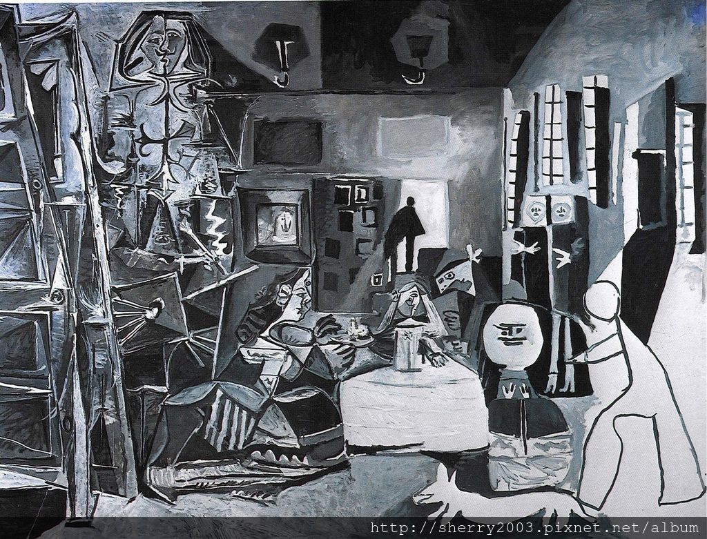 抽象版侍女(Las Meninas)(1957),之前有提過,畢卡索把畫家本身拉得跟畫面一樣高,顯示了畫家高尚的一面說。