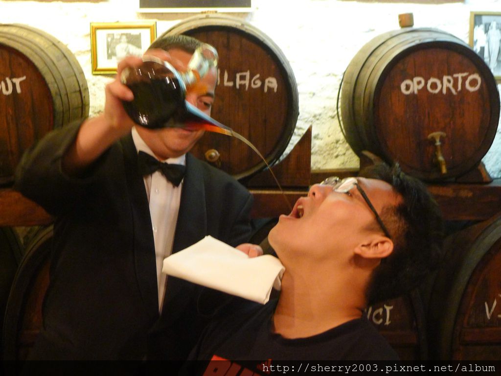 服務生最後來跟大家玩接甜酒,隔好遠接甜酒喝,沒注意會噴到衣服喔!