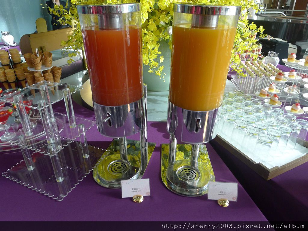 飲料有兩種,柳橙汁與葡萄柚汁,不是現打的。