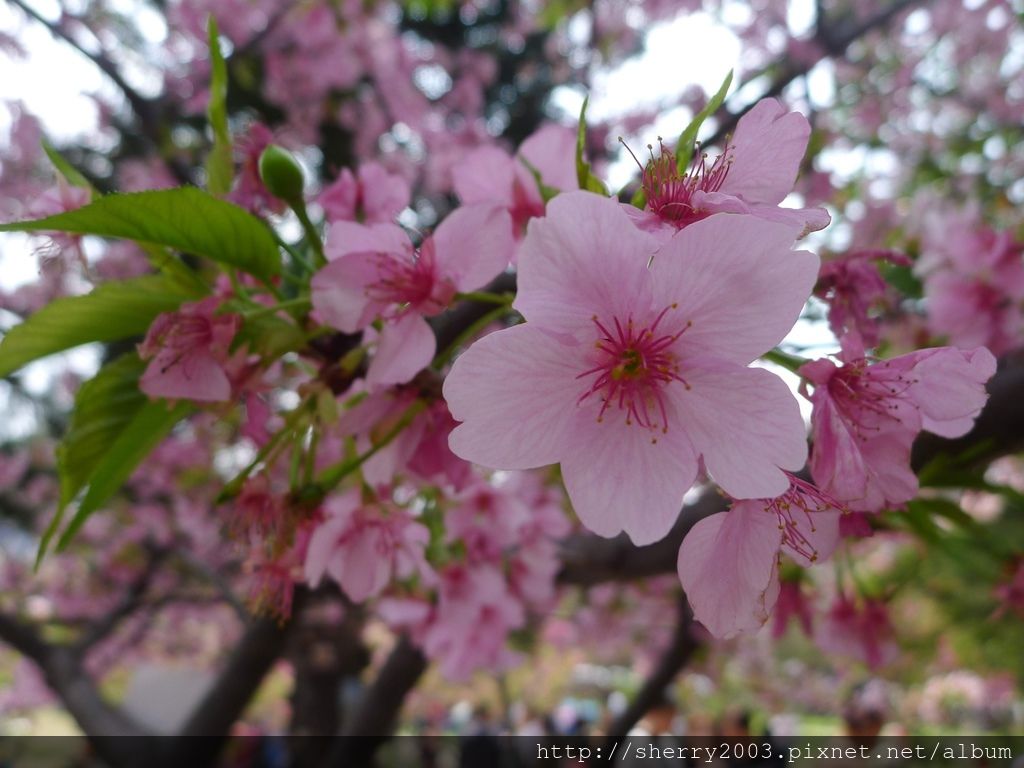 步道兩旁的河津櫻正努力展現著她的美麗。