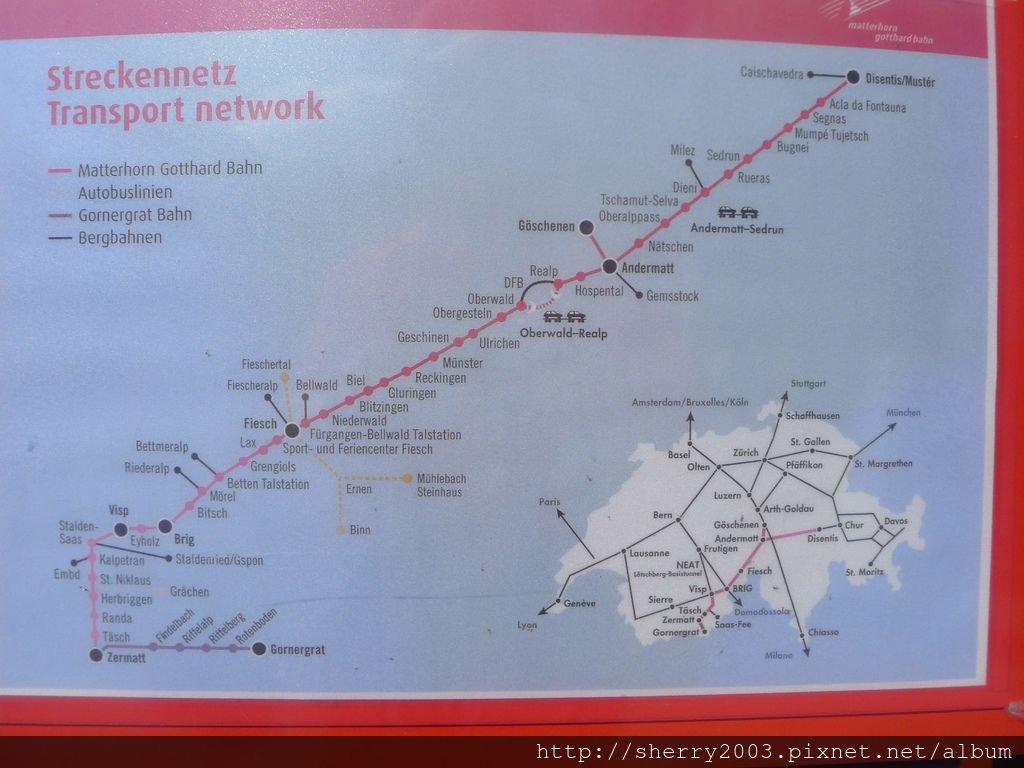 來看看,這是冰河列車位於瑞士主要鐵道的路線圖,以及全程的站點。