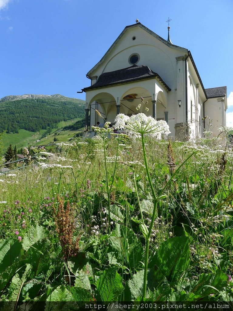 安德馬特小鎮,搖曳在花叢後的洛可可小教堂,有著阿爾卑斯的白色美麗。