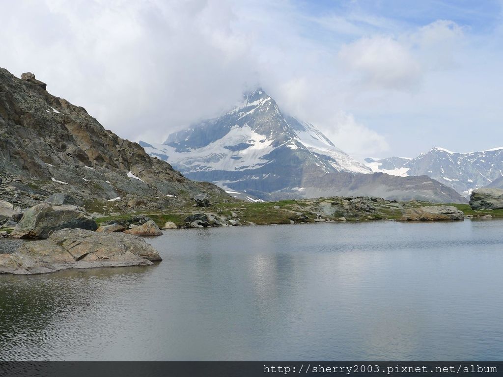 從湖面延伸出去的馬特洪峰,仍有大半在雲層中。