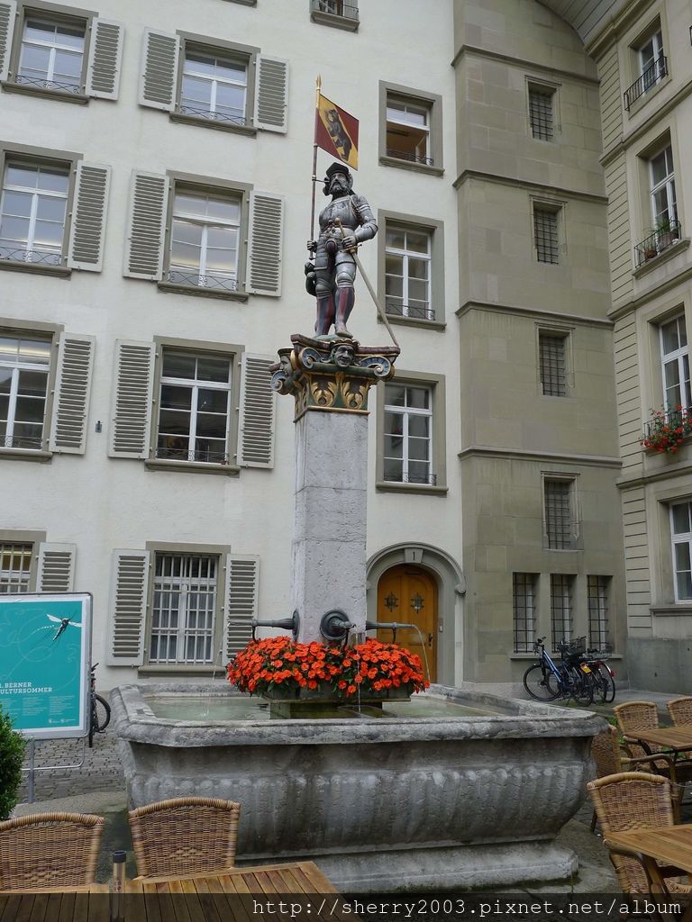 旗手噴泉(Vennerbrunnen),手拿伯恩城旗幟,後方站著一隻小熊,代表守衛城市秩序的至高地位。