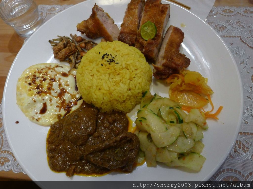 艷麗招牌飯($250),集合了巴東牛肉飯與薑黃雞腿飯的招牌料理,雞腿炸得很有味道,肉汁都鎖住了,但是卻不會太油膩,這點我們愛。