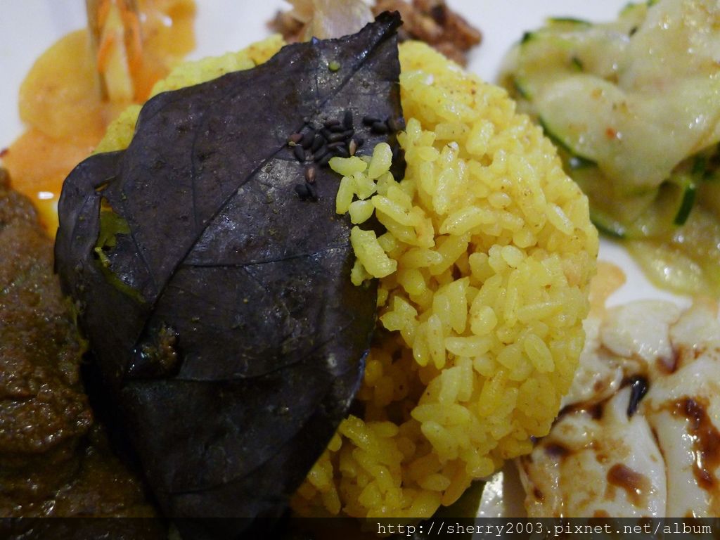 對,沒錯,店家提供的是顧腸胃的薑黃飯,稍微偏乾的米飯,就是要配南洋各式醬汁來變化。