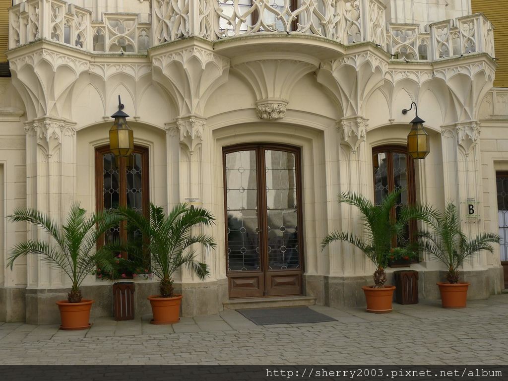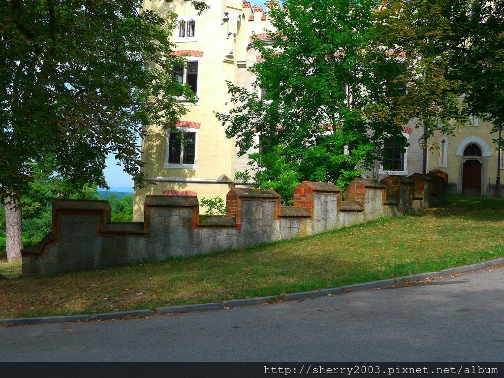 在指示圖旁,有一棟也類似城堡外觀的建築,這是改建成飯店Hotel Stekl的部分,真正的琥珀卡城堡還要往上一小段。