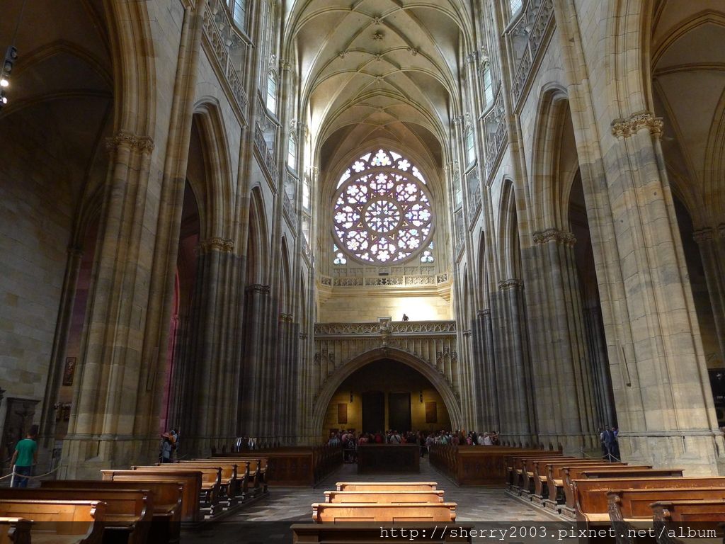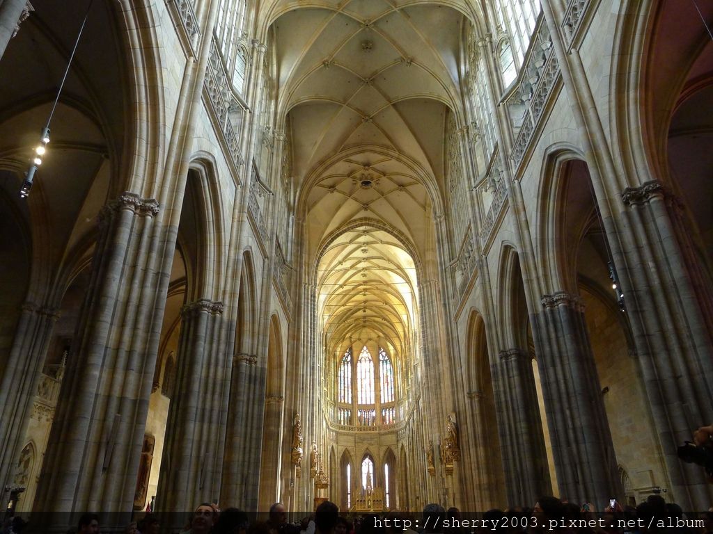 穿過第一、二中庭後,來到城堡區的首要目標,也就是聖維特主教座堂(Katedrála svatého Víta),這是捷克最大的教堂,全名聖維特、聖溫塞斯拉斯和聖阿達爾貝特主教座堂,這麼長的名字光用看的眼睛就在抖了。