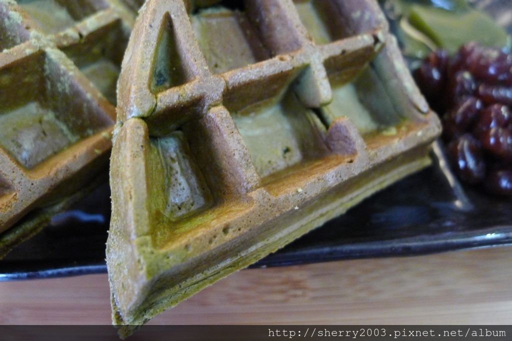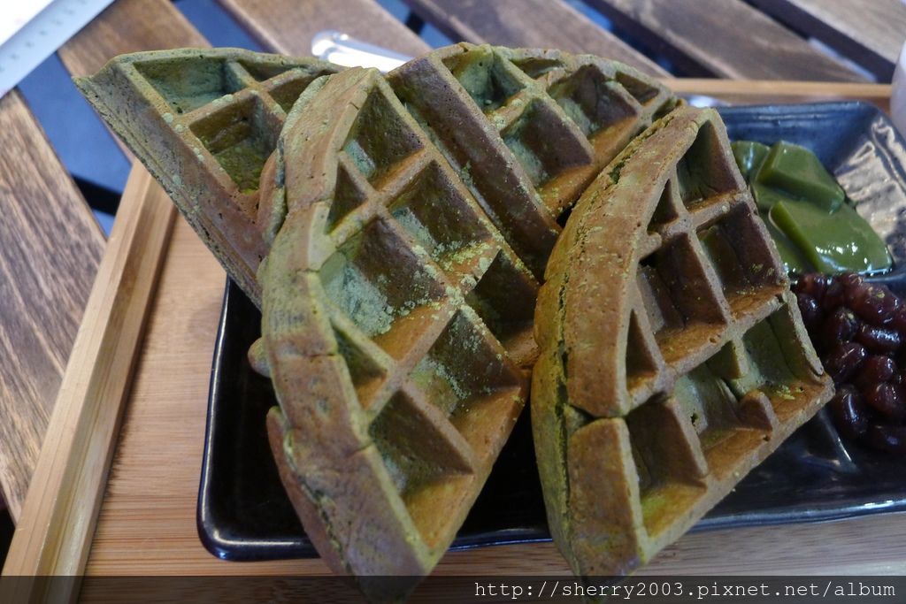 厚實的口感,讓我們很好奇,跟店家聊天間得知,店家的抹茶鬆餅完全不加泡打粉,真材實料的鬆餅讓人吃得更美味,也更健康,看我家實驗小白鼠小Sherry吃了都不會脹氣就可以證明。