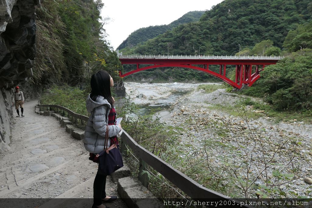 後方高聳的砂卡礑大橋,鮮紅的色彩氣勢十足。