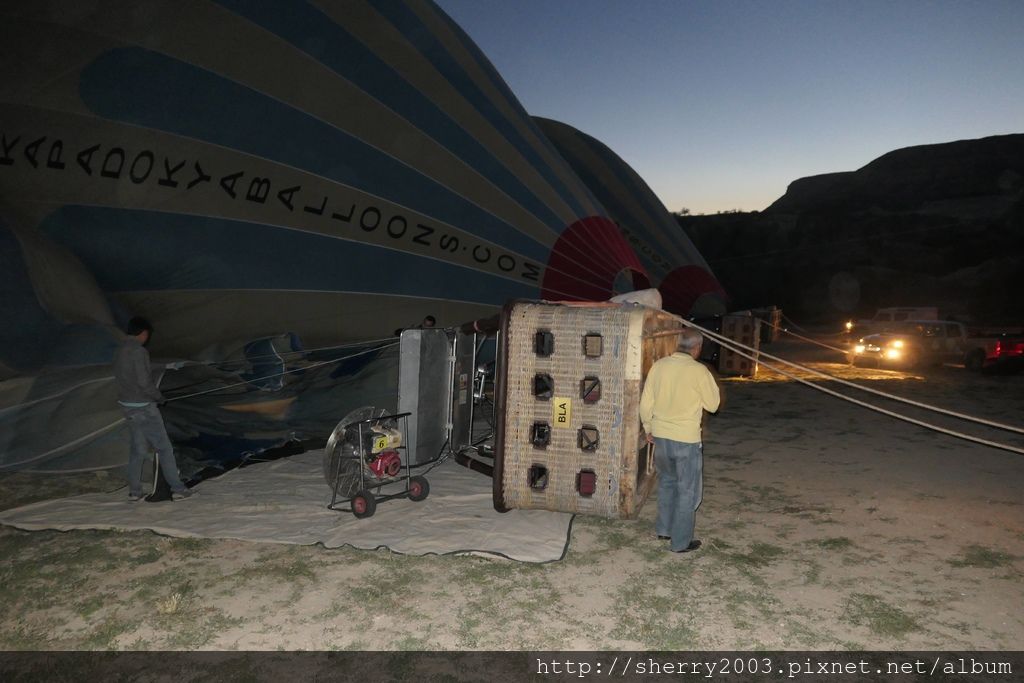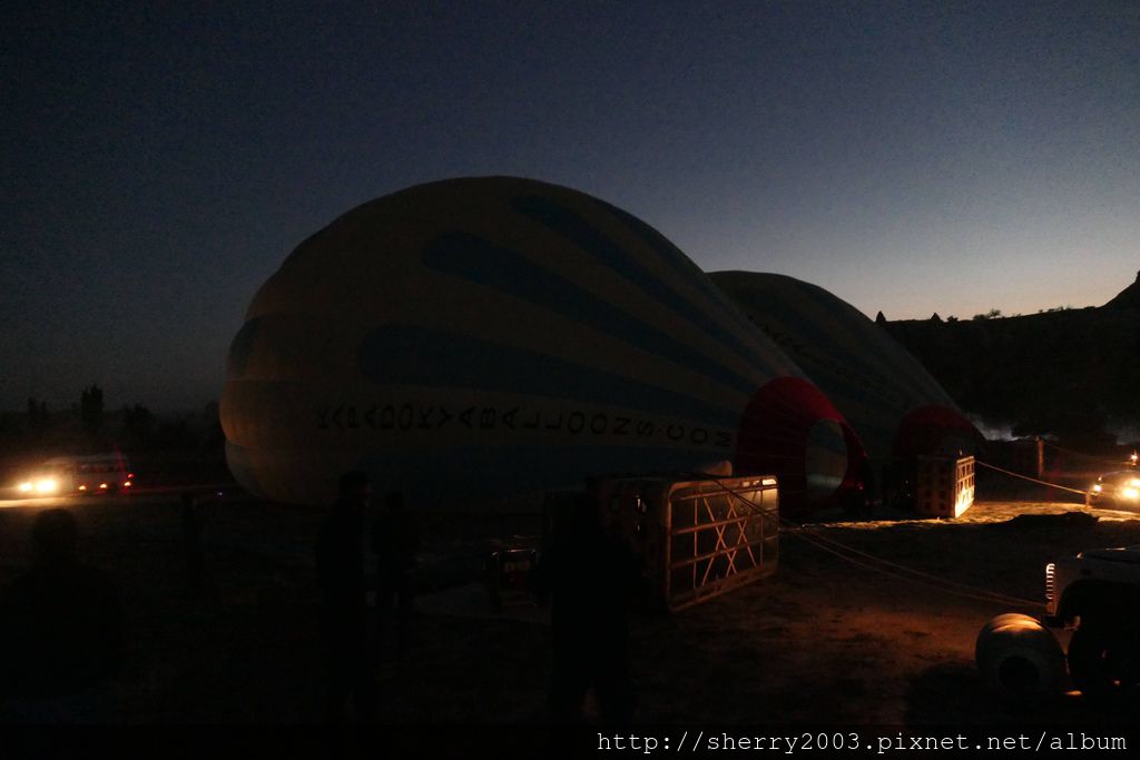 抵達起飛地點,天色仍是一片昏黃,隱約可以看見熱氣球。