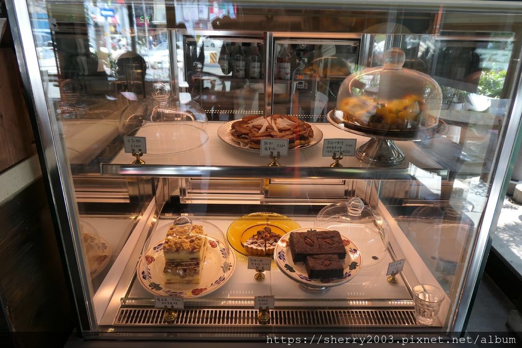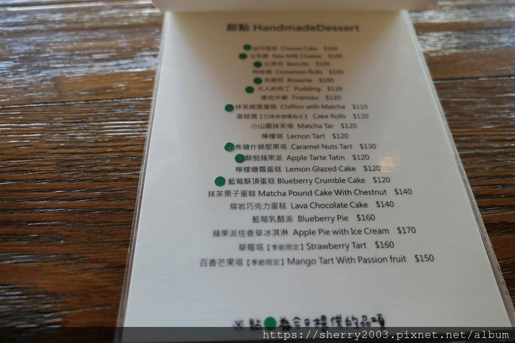除了咖啡,也有茶品,另外甜點種類也多,有標綠點的是當日有提供的,也可以去甜點櫃直接看成品。