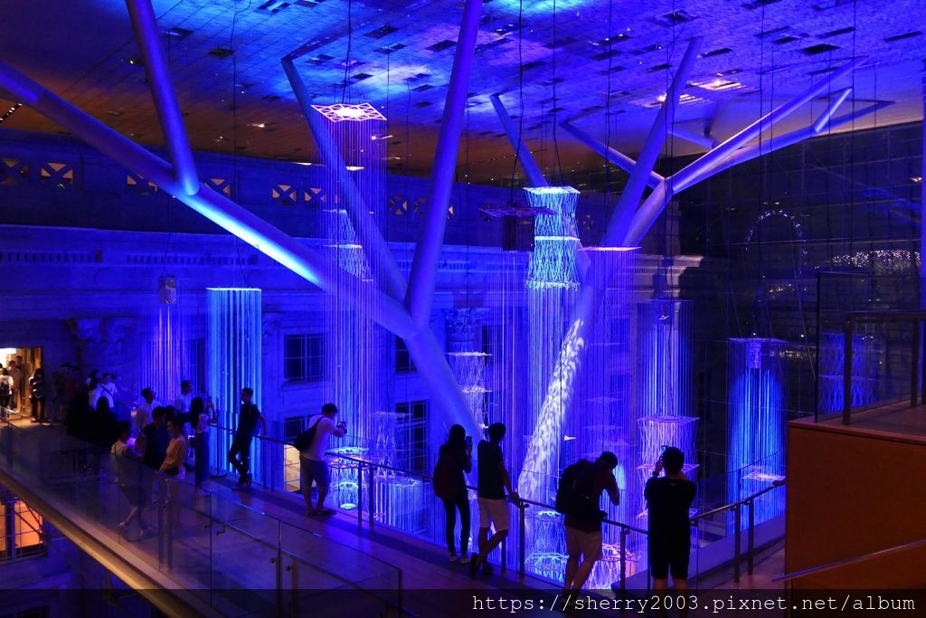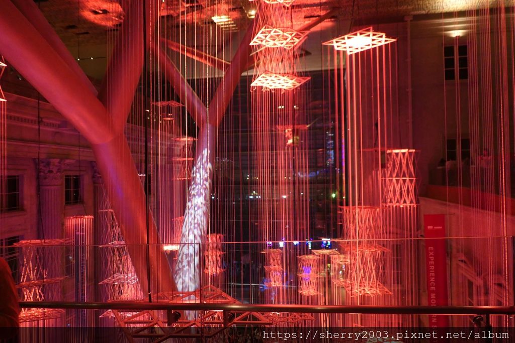 仔細靠近看,其實是由上下方的燈光投射在銀白色的金屬線條上,進而創造出如此瑰麗的色彩變換。