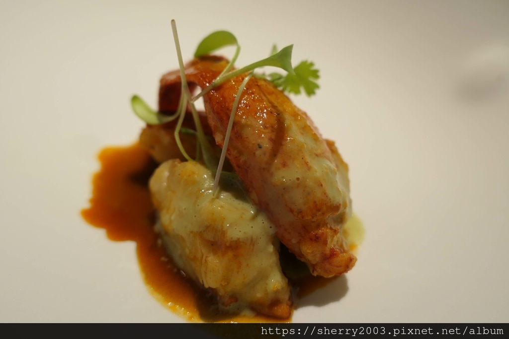 主餐的龍蝦採用綠咖哩與美式醬,莫名地有種荷蘭醬的風味,微甜不酸的醬汁並不會搶了主角的風采,與生蠔的鮮味為主不同,龍蝦是以甜度滿分來搶戲。