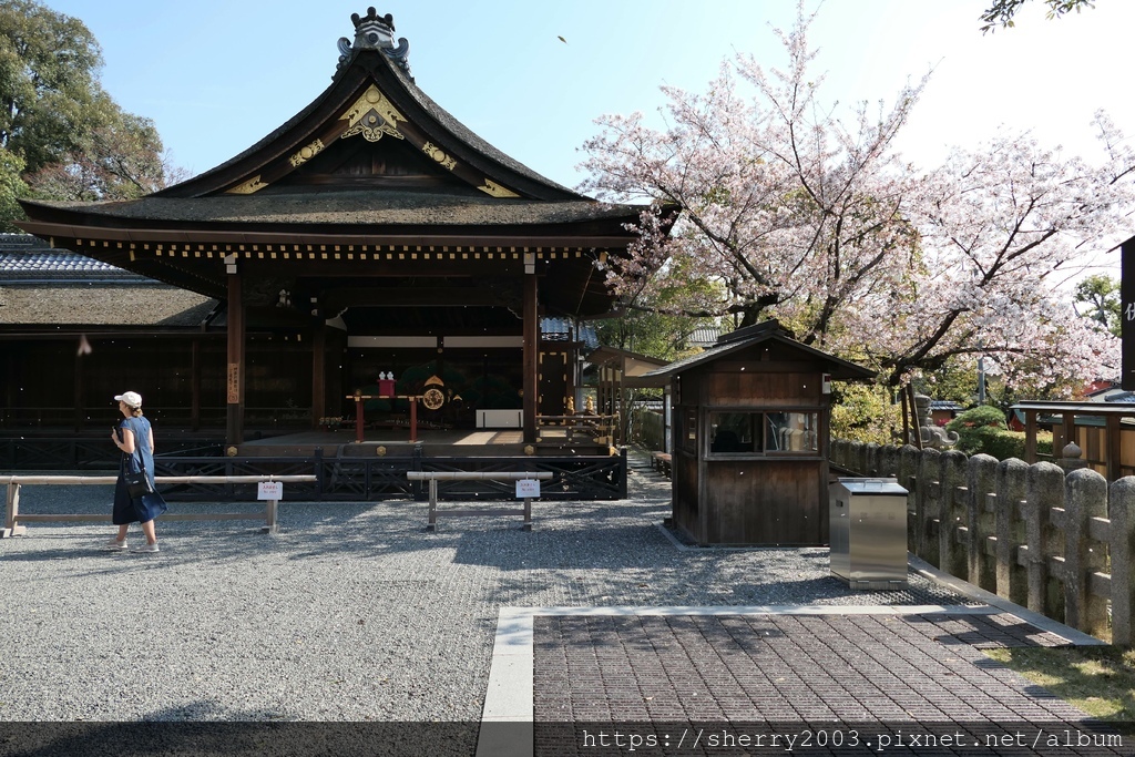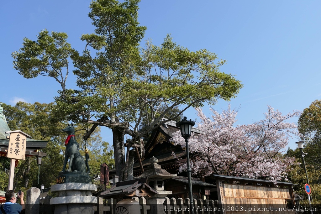 走進稻禾大社,少數顏色沉穩的建築,這是神楽殿,搭配一旁的櫻花很有味道啊。