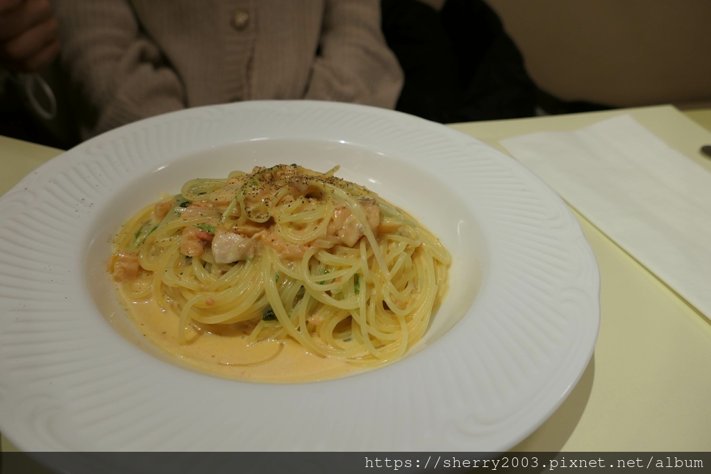 鮭魚蘆筍奶油麵(¥2,200),其實分量不算大,但麵條吸汁的滋味頗為香濃,蘆筍清爽、鮭魚帶著些許的海味,是很搭的標準義式料理。