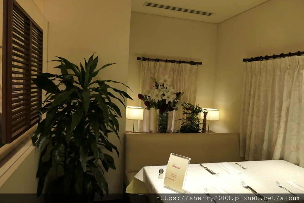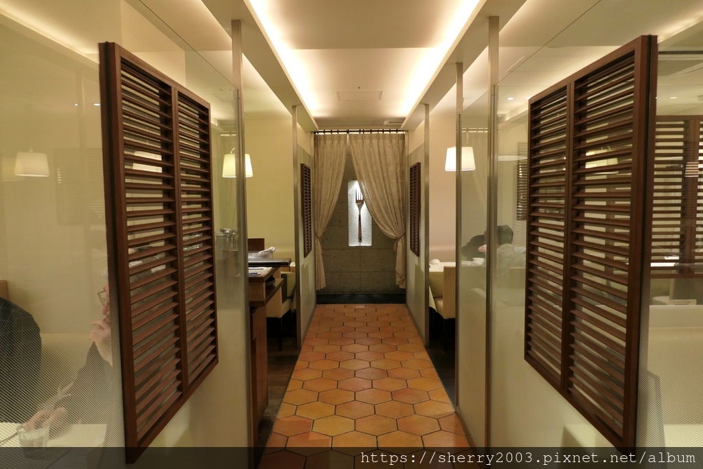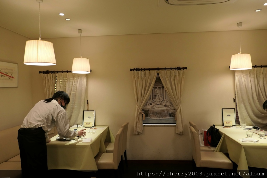 格子木窗,以及純白的牆面,白紗舖上的桌面,帶點鄉村的典雅風,後方牆上的艾曼紐二世迴廊,似乎反映了主廚的義大利經歷。