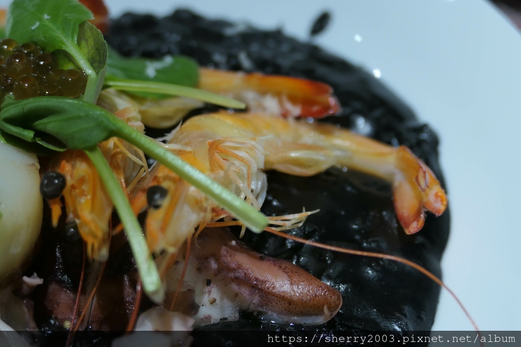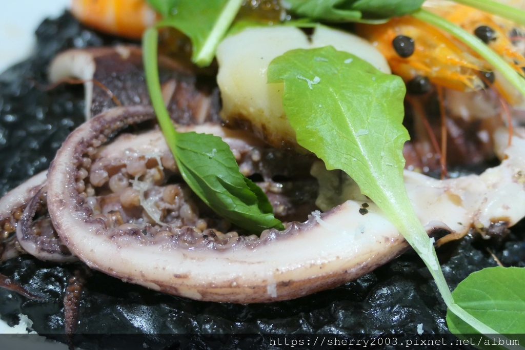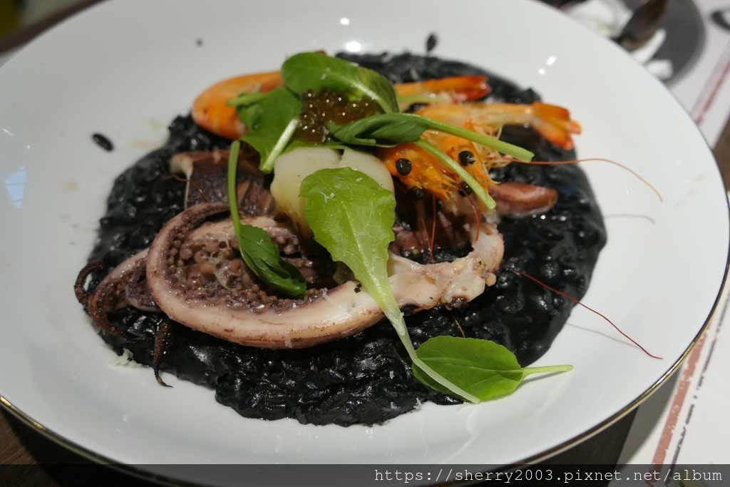 威尼斯海鮮墨魚燉飯($420),價格不低,墨魚口感也夠,但我們比較希望海鮮是透抽,才值這個價格。