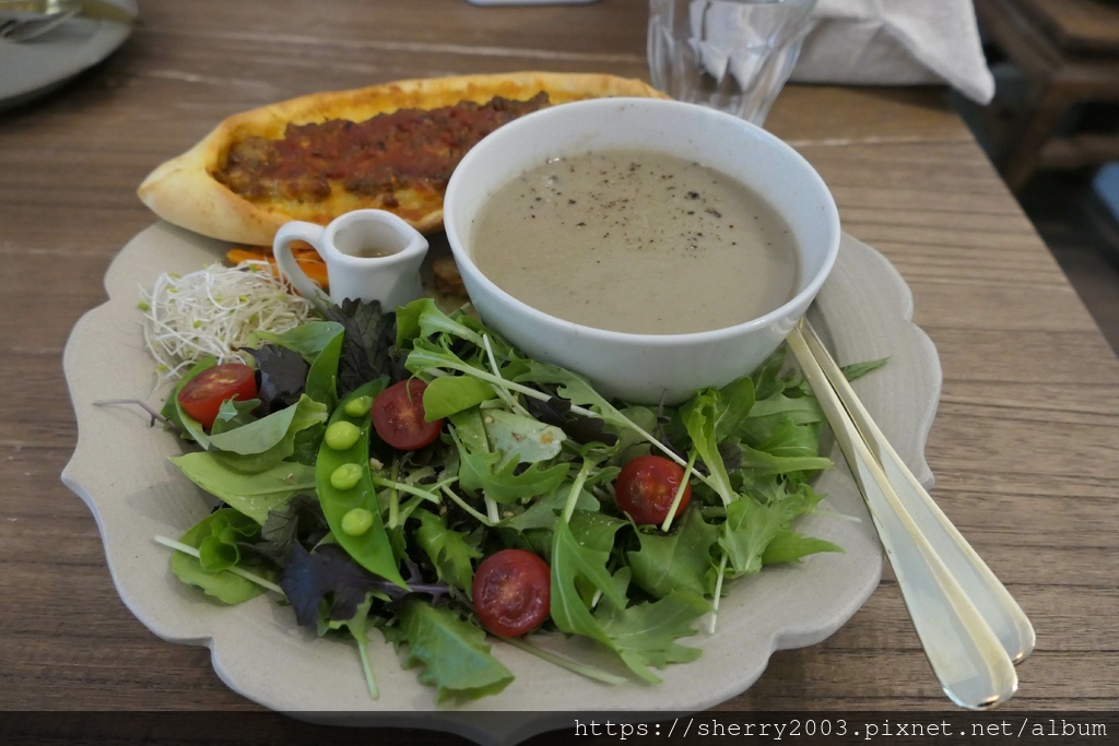 先來份義式船型披薩拼盤($280),有種土耳其概念股的感覺,沙拉新鮮,種類跟量都很多,毫不手軟啊,菇菇奶油湯也很溫順美味。