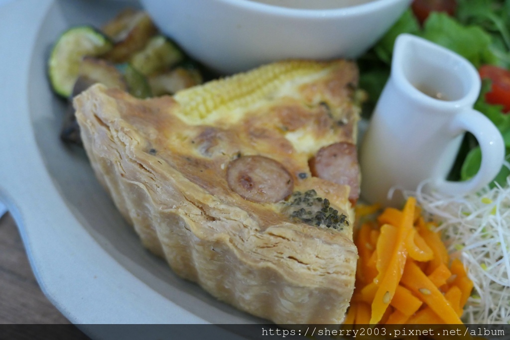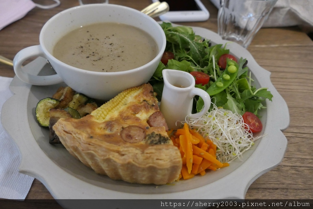 另一份點了每日鹹派拼盤($300),法式鹹派的餡料滿檔,派皮是扎實的千層風,而不是滿滿奶油香的那種,但內餡很有多層風味,整體是不錯的。