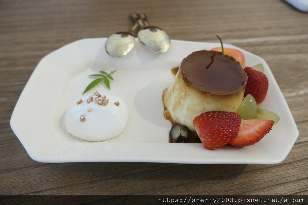 不只正餐,還有餐後的波藤水果布丁($120),加了焦糖的香氣,與搭配的水果很合,奶油可沾可不沾,吃起來變化不大。