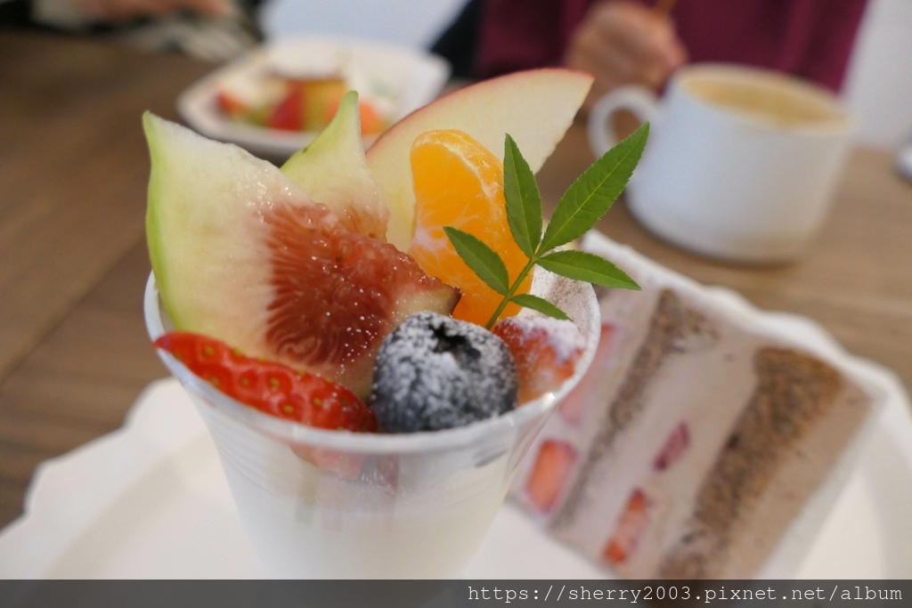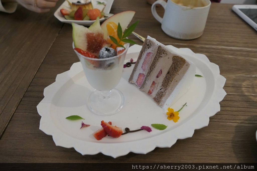 季節限定,冬季草莓巧克力奶霜戚風蛋糕佐綜合水果義式奶酪杯,看到無花果就大爆發了,開心的大口享受。