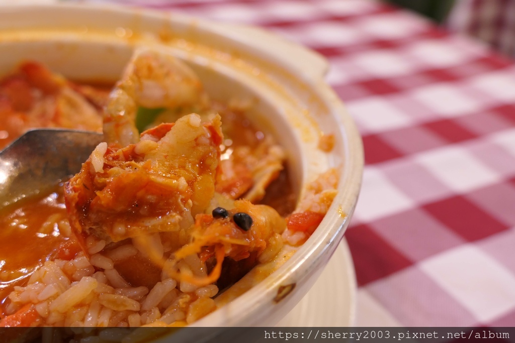 葡式招牌的葡式海鮮煲飯(MOP 238),換算台幣破千,中間有一隻蟹肉應該勉強抵得上,整體味道很濃郁,是道充滿鮮味的燉飯。