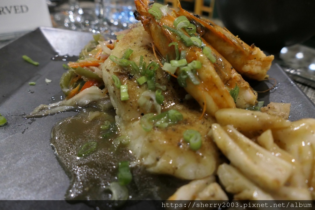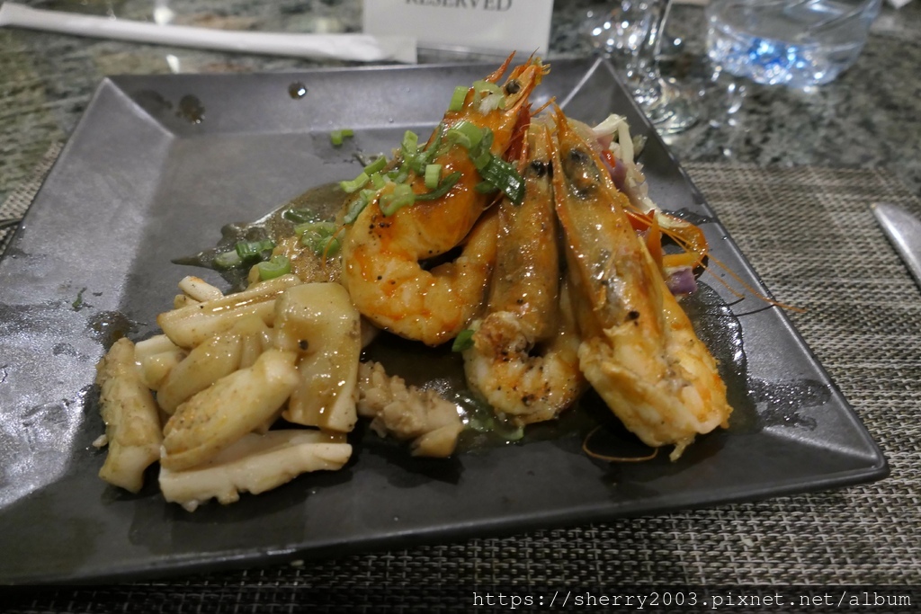 主餐比較有趣,與想像的日式料理不同,是海鮮拼盤喔,有大蝦、魚肉、魷魚以及青菜,是鐵板料理手法啊!
