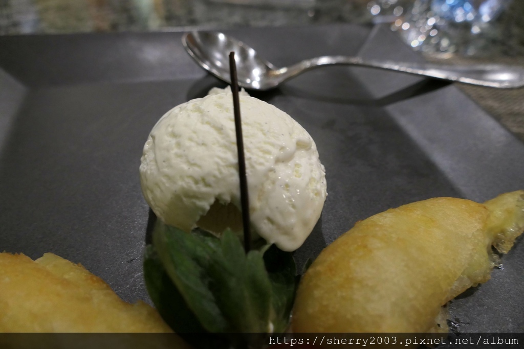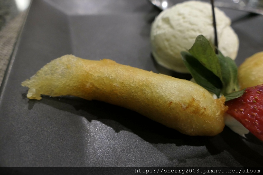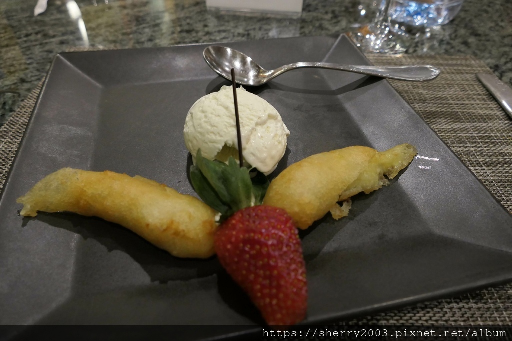 甜點更特別了,南洋特有的烤香蕉配上香草冰淇淋以及草莓點綴,烤香蕉是真的甜了,配上香草冰淇淋更甜。