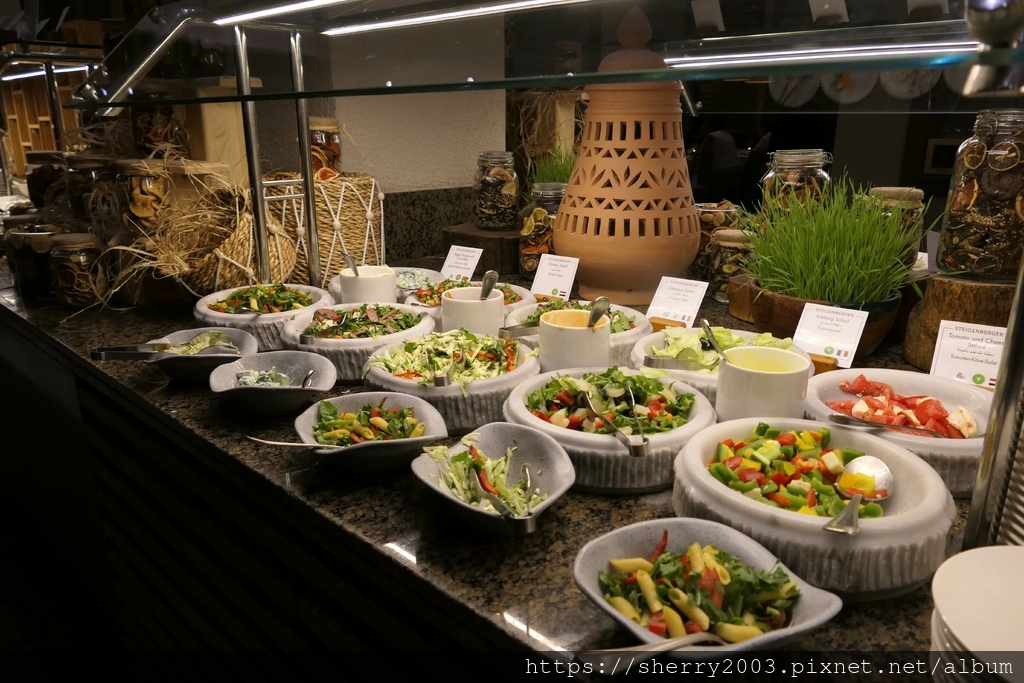 側邊走完,往中間移動,餐廳都把相近的擺在一起,方便取用,但這也太多類了喔,生菜沙拉就三十幾種了。