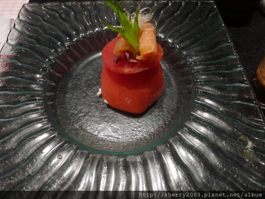 先附~燻鮭魚番茄沙拉,大顆的牛番茄,內部其實已經挖空,塞滿了洋芋泥,上面配著薄薄的燻鮭魚,很有創意又可口的一道。
