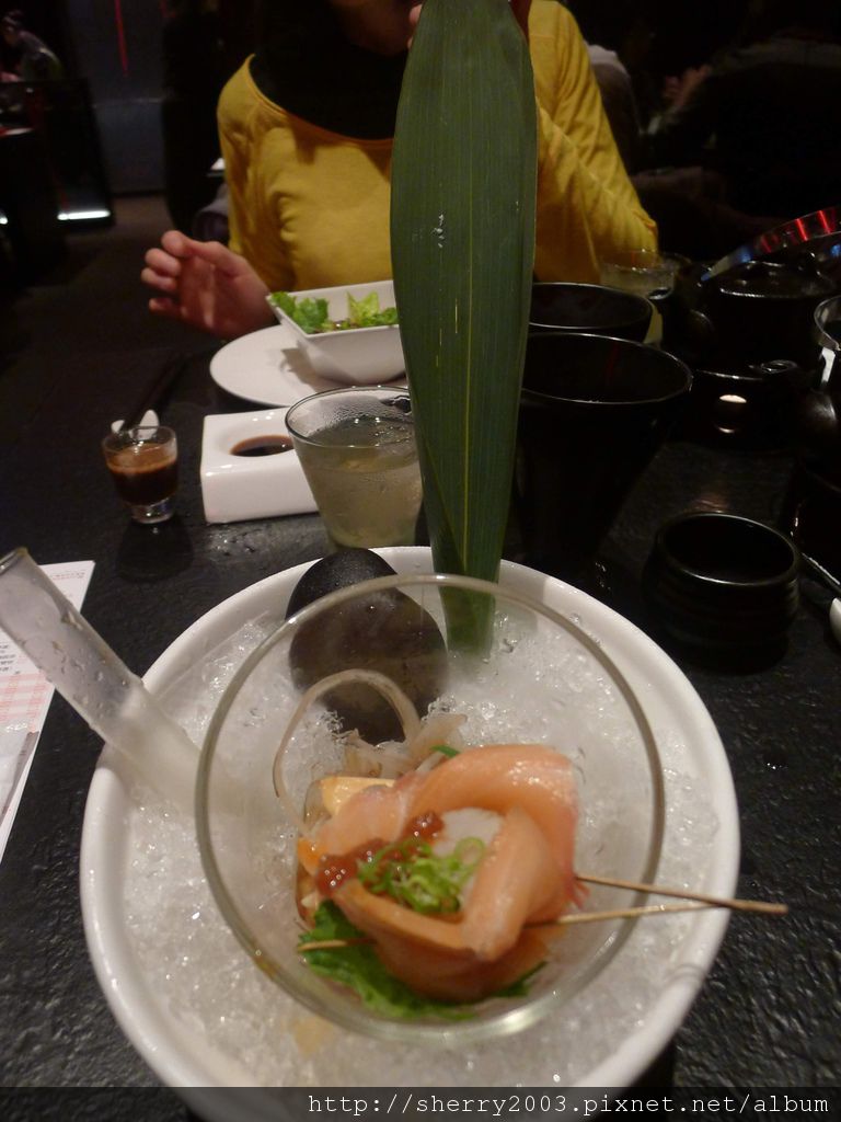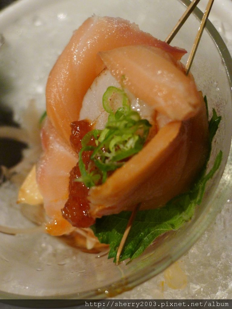 刺身/煮物~燻鮭魚炙干貝,又是燻鮭魚耶,聽說煙燻的食物超毒的,不過這邊的燻鮭魚應該只有簡單的過一下,還好還好。