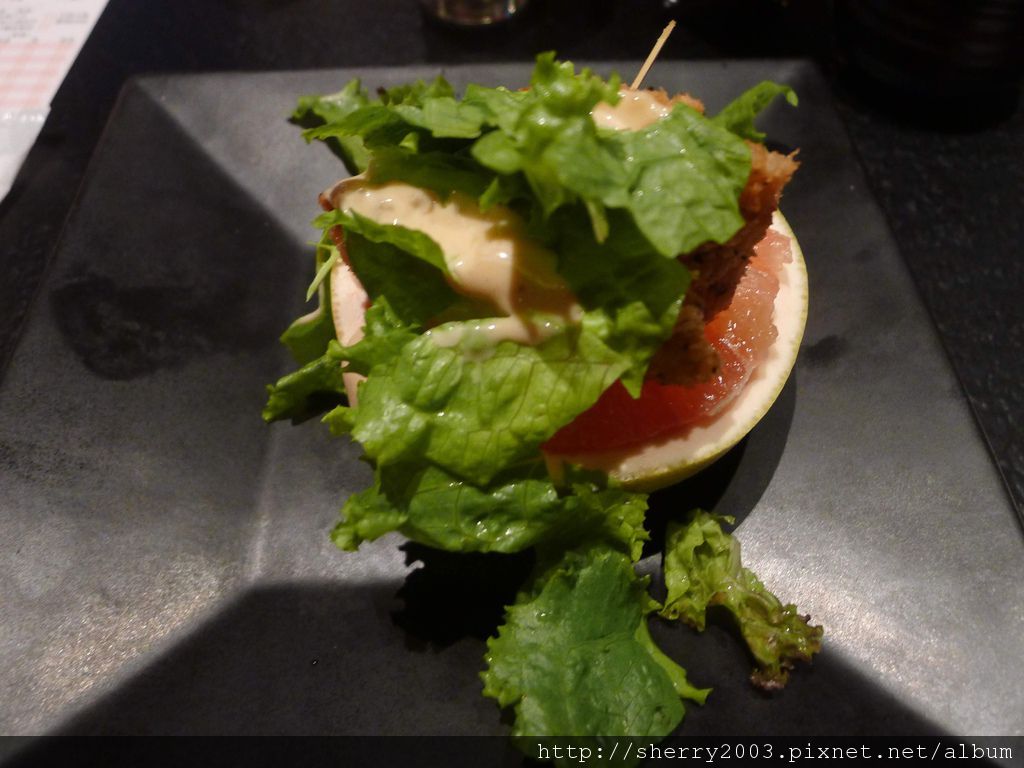 小品之一~銀鱈葡萄柚,這是酥炸的鱈魚配合多汁的葡萄柚,葡萄柚的甜度很夠,足以解開炸物的膩味,搭配度十足。