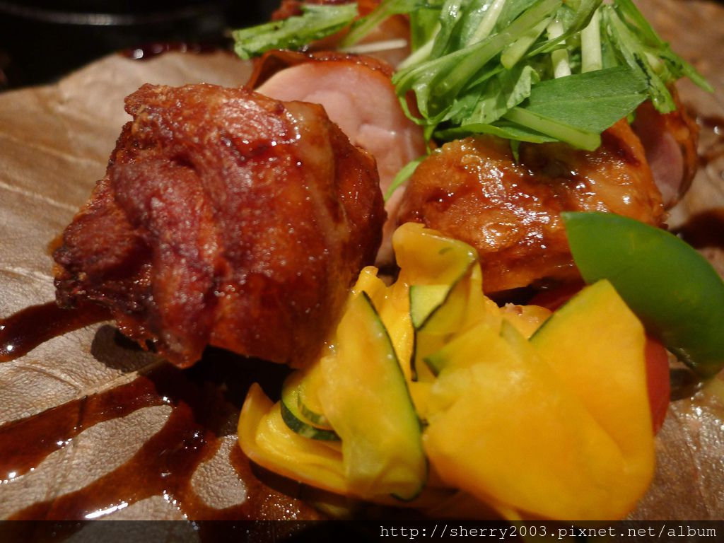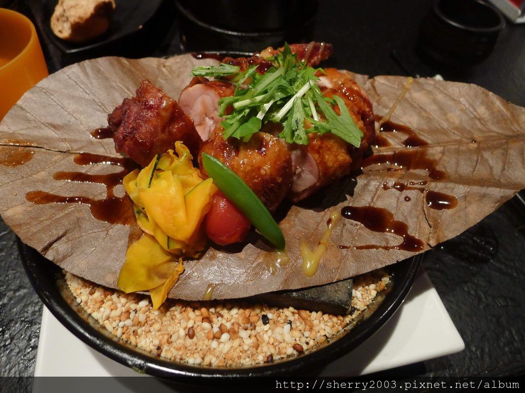強肴~雞肉朴葉燒,把去骨春雞的雞腿用照燒處理後,隔著朴葉以高溫石坂燒烤,把朴葉味道帶入雞腿中,據說是飛驒高山的豪爽吃法,Sherry一個人幾乎把雞肉吃光光。